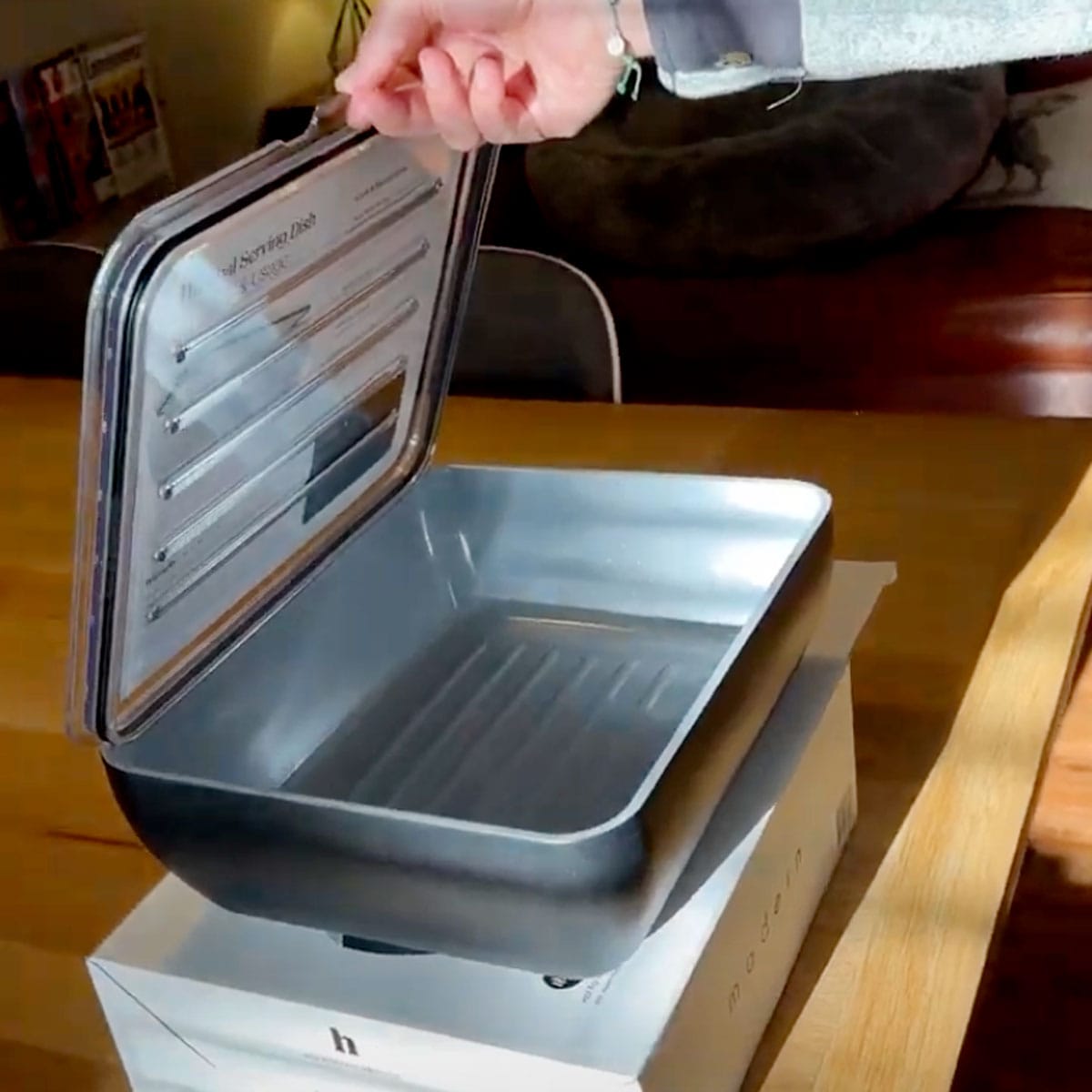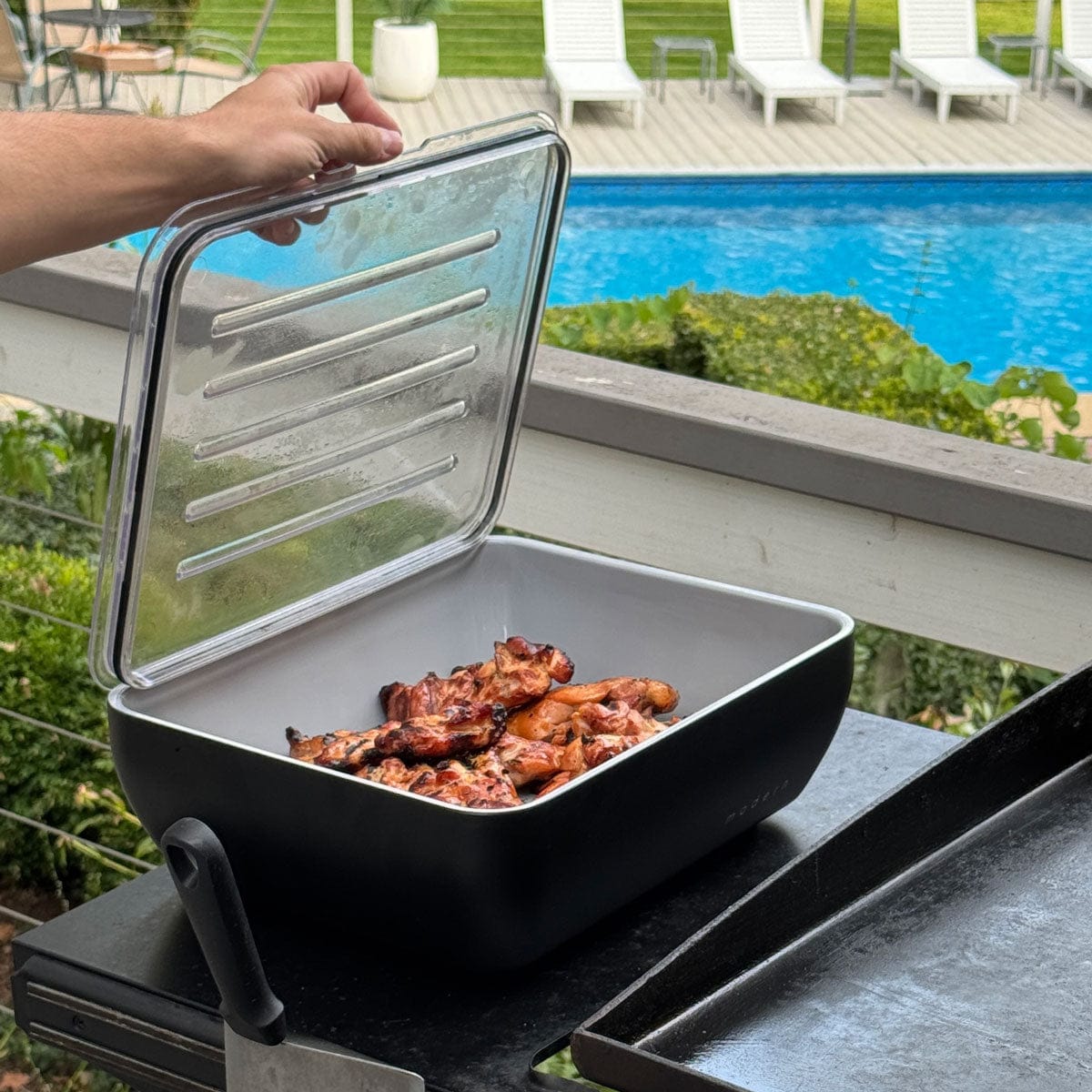 Our Serve Dish is designed to keep food hot or cold for hours using a double wall thermal insulated stainless steel base and a tight-sealing lid.